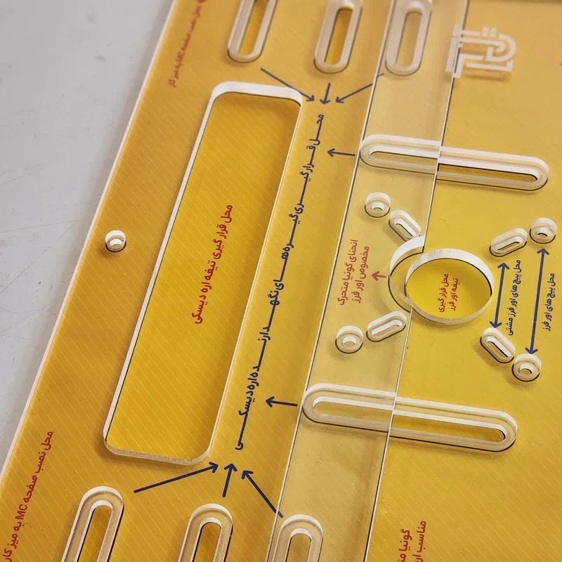 تبدیل اره دیسکی به اره میزی و تبدیل اور فرز به فرز میزی  MC board همان طور که از نامش مشخص است یک نوع تبدیل است که برای تبدیل اره دیسکی به اره میزی و هم برای تبدیل اورفرز به فرز میزی می توان از آن استفاده کرد. این محصول برای همه مدل اورفرز, اره دیسکی و فرز مشتی قابل استفاده می‌باشد. داراری گونیا متحرک دو حالته ( مورد استفاده برای اره دیسکی و اور فرز )  این مدل تبدیل شامل یک صفحه پلکسی با اکرولیک بالا و با بهترین متریال و کاملا نشکن با ضخامت 8 میل و مقاوم برای هرنوع ابزاری می‌باشد. این محصول به همراه 4 گیره ارائه میشه که با استفاده از این گیره می‌توان صفحه اره دیسکی را کاملا محکم نگه داشت. این صفحه دارای گونیای متحرک برای اورفرز و اره دیسکی می‌باشد. نصب این صفحه بسیار آسان است و با شش عدد پیچ روی میز ها به راحتی نصب می‌شود. اندازه گذاری لیزر شده در اطراف این صفحه می‌باشد که می‌توان به راحتی گونیای متحرک را جا به جا کرد. این صفحه تبدیل اورفرز و اره میزی امکان برش فارسی هم دارد. فاصله سوراخ های مناسب اور فرز بزرگ 8.5 سانتی متر می باشد. این تبدیل مناسب اره دیسکی هایی است که ابعاد مقطع مستطیل شکل کف دستگاه کم تر از ابعاد 38/5 در 21 باشد. میتوانید با تماشای گالری تصاویر محصول از محل قرار گیری دقیق سوراخ ها مطلع شوید